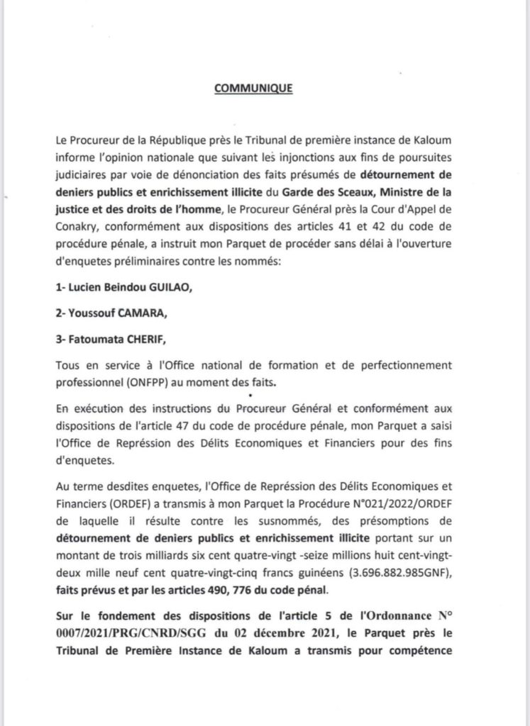 Après avoir reçu des injonctions aux fins de poursuites judiciaires de la part du ministre de la justice et des droits de l’homme, le procureur du tribunal de première instance de Kaloum, Mamadou Mafassouba annonce avoir transmis ce jeudi à la Cour de Répression des Infractions Economiques et Financières (CRIEF) un dossier de détournement de deniers publics dans lequel sont cités les nommés Lucien Bendou Guilao, Youssouf Camara et Fatoumata Chérif, tous en service à l’ONFPP au moment des faits. Ils devront s’expliquer sur le présumé détournement de plus de 3 milliards de francs guinéens.
