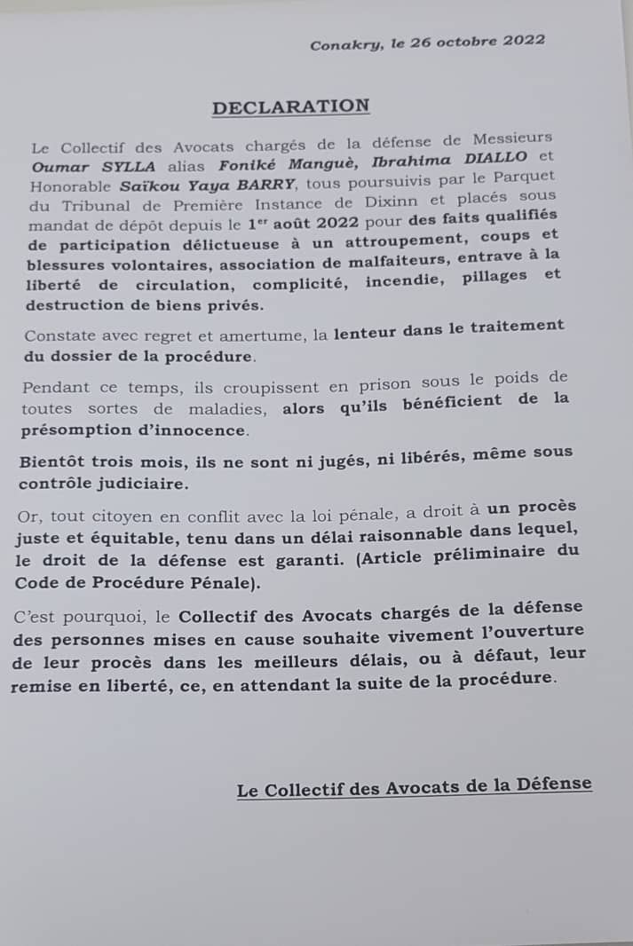 A travers copie d’une déclaration parvenue ce jeudi, 27 octobre à la rédaction d’avenirguinee.org, le collectif des avocats de Foniké Menguè (coordinateur national du FNDC) d’Ibrahima Diallo (responsable des opérations du FNDC) et de Saikou Yaya Barry (secrétaire exécutif de l’UFR) hausse le ton et dénonce la lecteur de la procédure judiciaire. Ces hommes en robe noire appelle les autorités judicaires à procéder à l’ouverture du procès concernant leurs clients.
