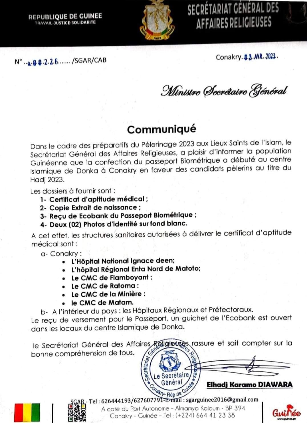 À travers copie d’un communiqué parvenue lundi soir à la rédaction d’avenirguinée.org, le secrétariat général des affaires religieuses annonce le début des activités du Hajj 2023.