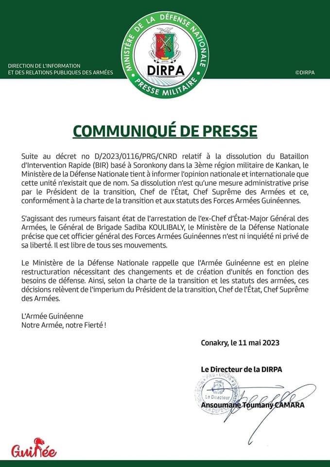 « S’agissant des rumeurs faisant état de l’arrestation de l’ex chef d’État major général des armées le Général de brigade Sadiba Koulibaly, le ministère de La défense nationale précise que cet officiel général des forces armées guinéenne n’est ni inquiété ni privé de sa liberté. Il est libre de tous ses mouvements. Le ministère de la défense nationale rappelle que l’armée guinéenne est en pleine restructuration nécessitant des changements et de création d’unités en fonction des besoins de défense… ».