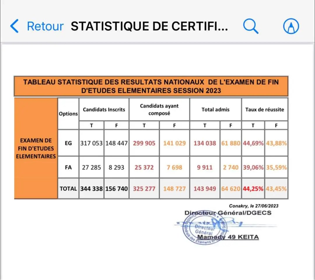 Le ministère de l’éducation nationale et de l’alphabétisation vient d’officialiser les statistiques de l’examen d’entrée en 7ème année. Sur toute l’étendue du territoire national, ce sont 143 949 qui sont déclarés admis sur 344 338 candidats inscrits, soit un taux d’admission de 44,25%. Ce résultat est largement supérieur à celui de l’année passée qui était à 17% d’admission.