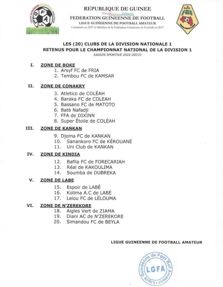 Ce samedi, 2 février, la Ligue Guinéenne de Football Amateur, sous la houlette du Président Thierno Abdoulaye Bah, vient d’officialiser les clubs retenus pour jouer l’édition 2022-2023. Désormais, ils sont 20 équipes retenues, dans le cadre de la Nationale 1 Guinéenne. Suspendue pour faute d’accompagnement, les dirigeants de la (LGFA) affichent la volonté de tenir cette saison, pour le bonheur des clubs.