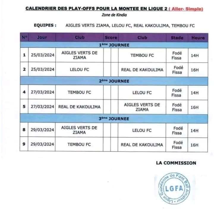 Lundi, 25 mars 2024, sous la houlette de la Ligue Guinéenne de Football Amateur, les Play-Offs pour la montée en Ligue 2 vont démarrer à (Kindia), au grand stade Fodé Fissa. Après les matchs de poules, organisés sur toute l’étendue, 4 équipes se sont qualifiées pour ces Play-Offs de la montée. Il s’agit de Lelou FC, Tembou FC, Aigles verts de Ziama, aussi le Réal de Kakoulima tous engagés pour la (D2)