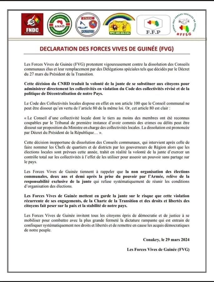 À travers une déclaration dont copie vient de parvenir à la rédaction d’avenirguinee.org, les Forces Vives de la Nation annoncent leur opposition à la dissolution des conseillers communaux, décision prise récemment à travers un décret présidentiel. Elles soupçonnent le CNRD de vouloir se « substituer aux citoyens pour administrer directement les collectivités en violation du Code des collectivités révisé et de la politique de Décentralisation de notre Pays ».