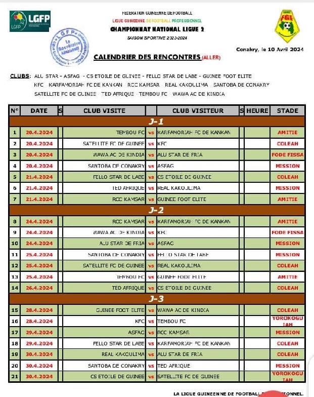 Ce jeudi , 11 avril 2024, la LGFP a rendu Officiel, sous l’autorité de Lucien Guilao, les 3 premières journées de ligue (2), au compte de la nouvelle saison. Après les Play-offs, dans le cadre de la montée en (D2), place aux hostilités de la Ligue (2).