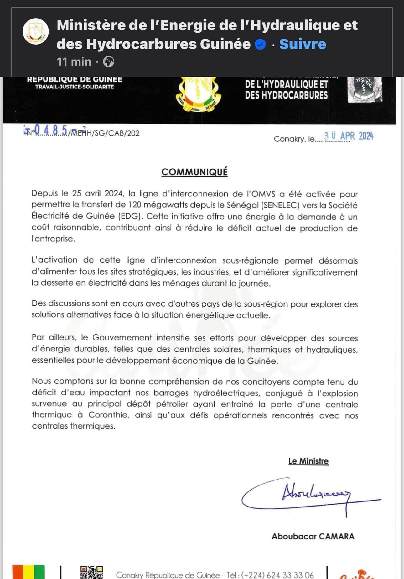 Dans un communiqué parvenu à la rédaction d’avenirguinee.org, le ministère de l’Energie de l’Hydraulique et des Hydrocarbures Guinée, informe l’opinion nationale de L’activation de la ligne d’interconnexion de l’OMVS depuis le Sénégal vers la Guinée. Cela offre 120 mégawatts d’énergie à un coût raisonnable, améliorant ainsi la desserte électrique nationale malgré les défis rencontrés.