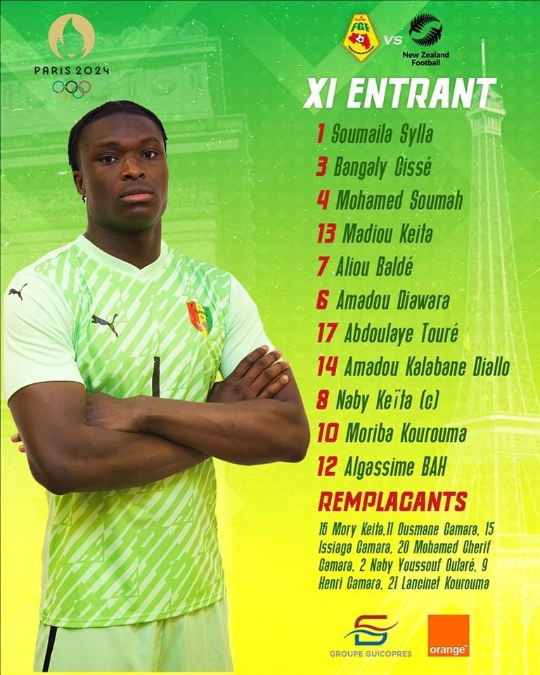 Dans le cadre des jeux olympiques de Paris, le Syli U23 affronte ce mercredi, à 15h, la nouvelle-Zélande. À quelques minutes de cette confrontation, le sélectionneur Kaba Diawara a dévoilé la liste de son 11 de départ.