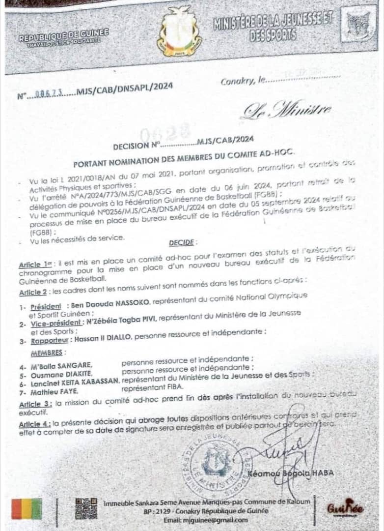 Ce lundi, 16 septembre 2024, le ministre des sports, Bogola Haba, vient de rendre officielle la nomination des membres du comité Ad-hoc, à la tête de la Fédération Guinéenne de Basket-ball. Objectif de la décision, examiner les nouveaux statuts de la Féguibasket et aussi l’exécution du chronogramme, permettant à la mise en place d’un bureau exécutif. Président du Comité Olympique, Elhadji Ben Nassoko aura la charge de conduire ce processus en cours, visant à doter l’institution d’un bureau exécutif élu au sortir d’une crise