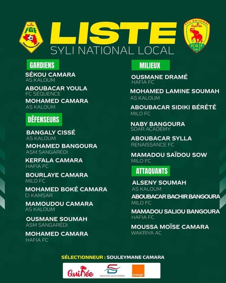 Ce samedi, Souleymane Abédi, coach du Syli national Local, a officialisé une liste de 21 joueurs retenus dans le cadre des préparatifs du CHAN 2024, prévu dans 3 pays africains. Et, avant les épreuves de cette édition, l’équipe Guinéenne défiera les Marocains les 13 et 15 octobre 2024 en match amical. Après le tirage au sort, la Guinée sera opposée contre la Guinée Bissau, pour tenter d’arracher son ticket de qualification pour le prochain (CHAN)