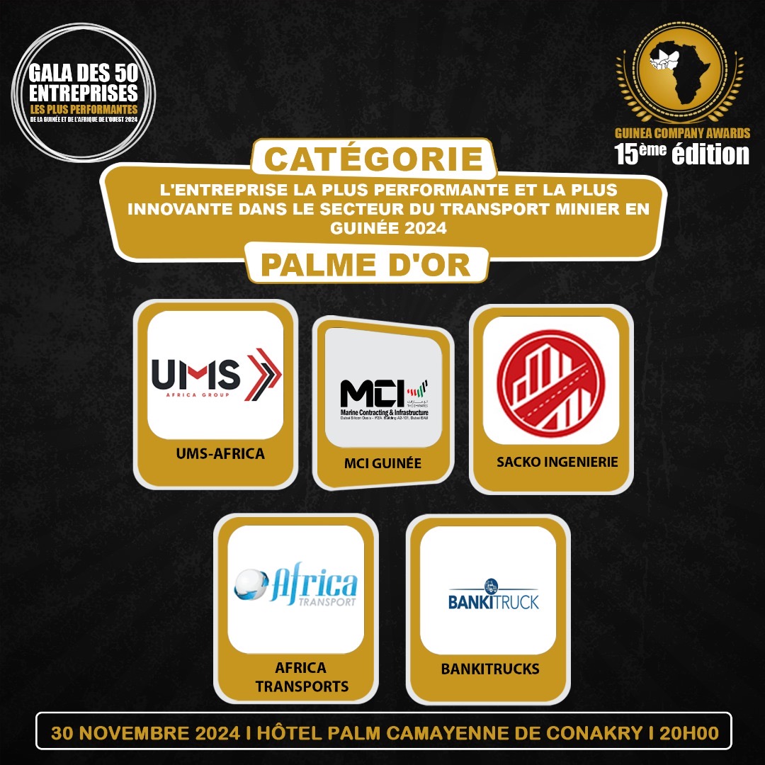 La 15ème édition du Gala des 50 Entreprises les plus performantes de la Guinée : Le voting grand public lancé pour la Palm D’OR DE L’ENTREPRISE LA PLUS PERFORMANTE ET LA PLUS INNOVANTE DANS LE SECTEUR DU TRANSPORT MINIER EN GUINÉE 2024