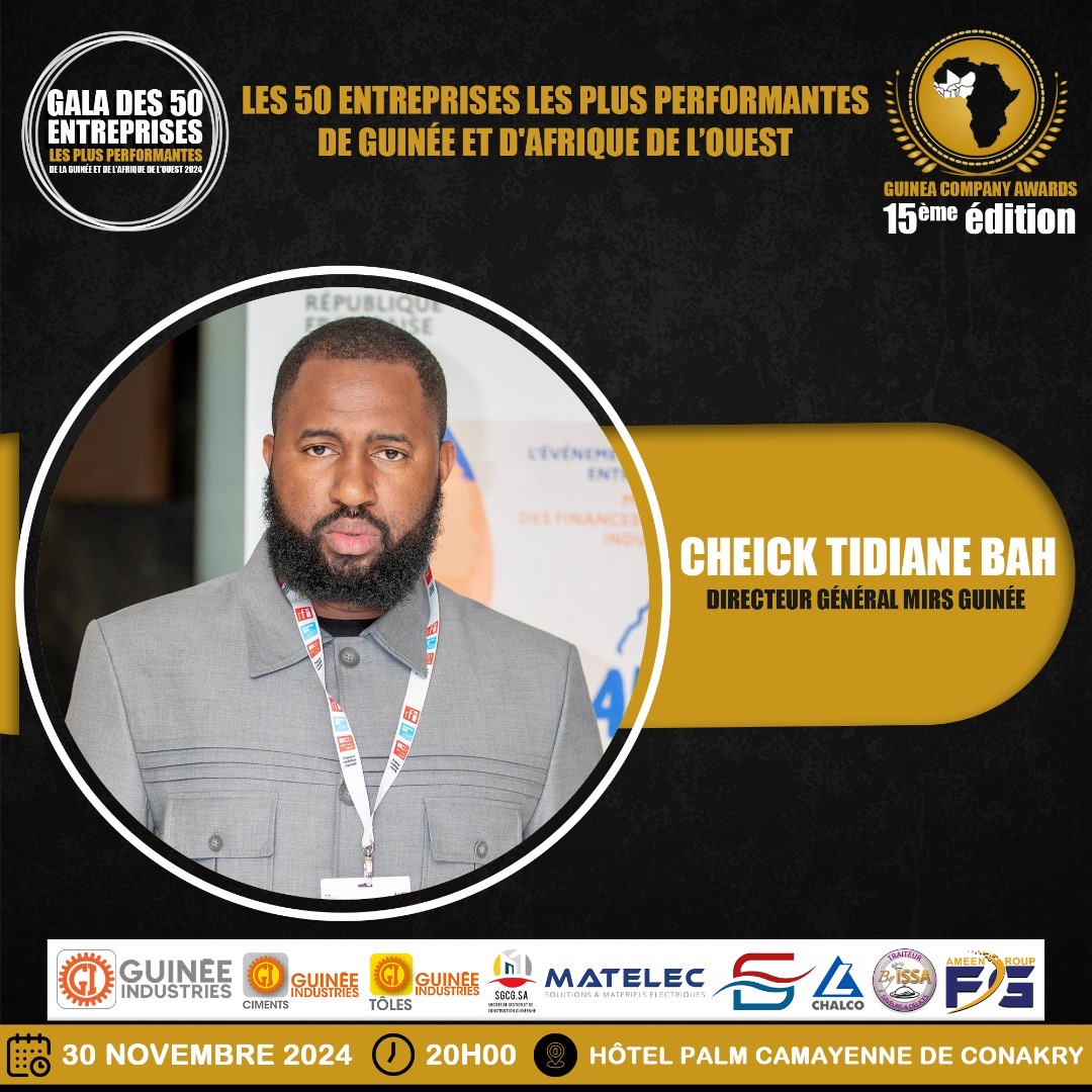 Nous avons le plaisir de vous présenter Cheick Tidiane Bah, le Directeur Général de MIRS Guinée, qui sera honoré lors de la 15ème édition des Guinea Company Awards. Cet événement tant attendu se déroulera le 30 novembre 2024 à l’Hôtel Palm Camayenne à 20h00.