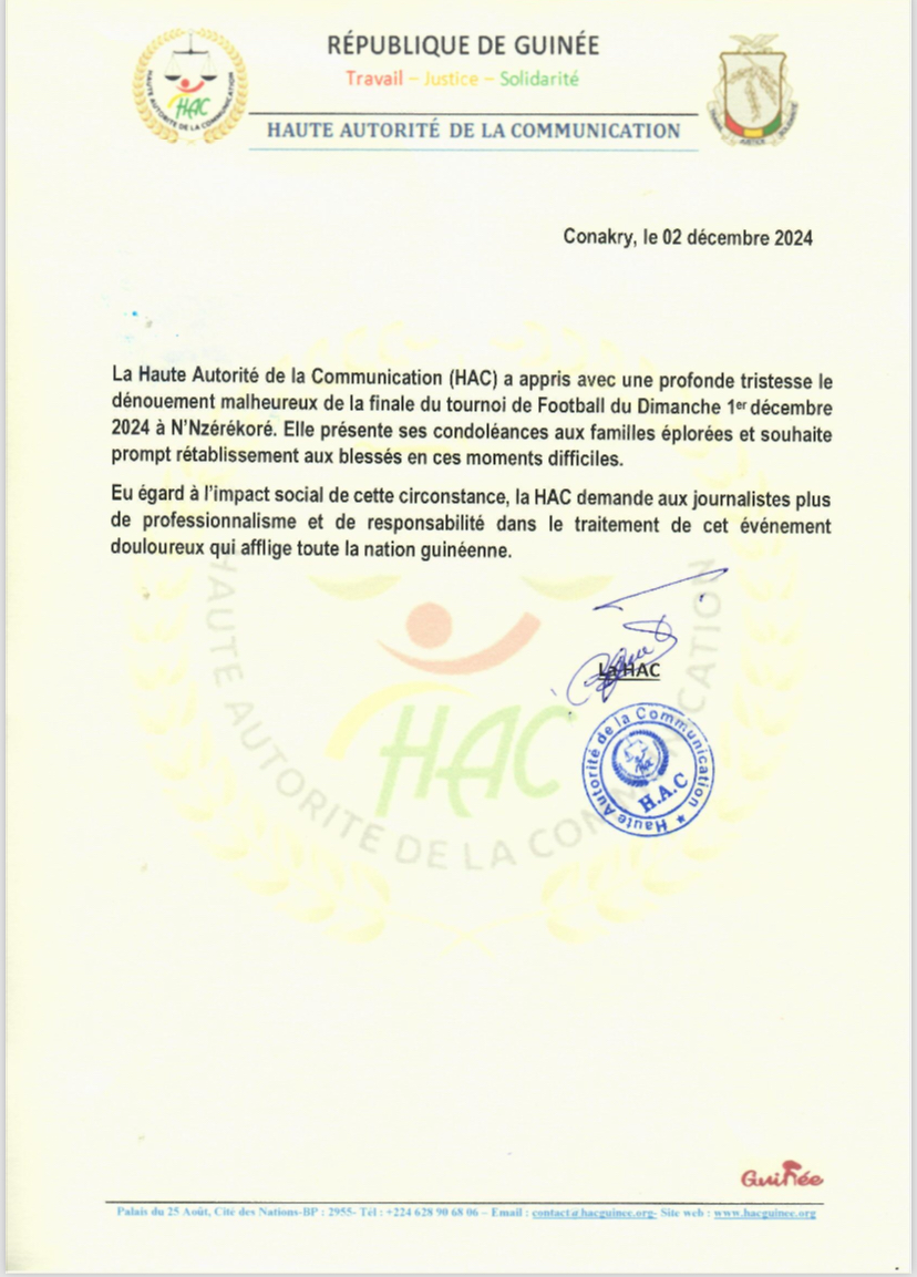 Un communiqué de la Haute Autorité de la Communication (HAC), parvenu ce lundi à la rédaction d’AvenirGuinee, exprime la profonde tristesse de l’institution face à la tragédie survenue lors de la finale du tournoi de football, le 1er décembre 2024, à N’Zérékoré.