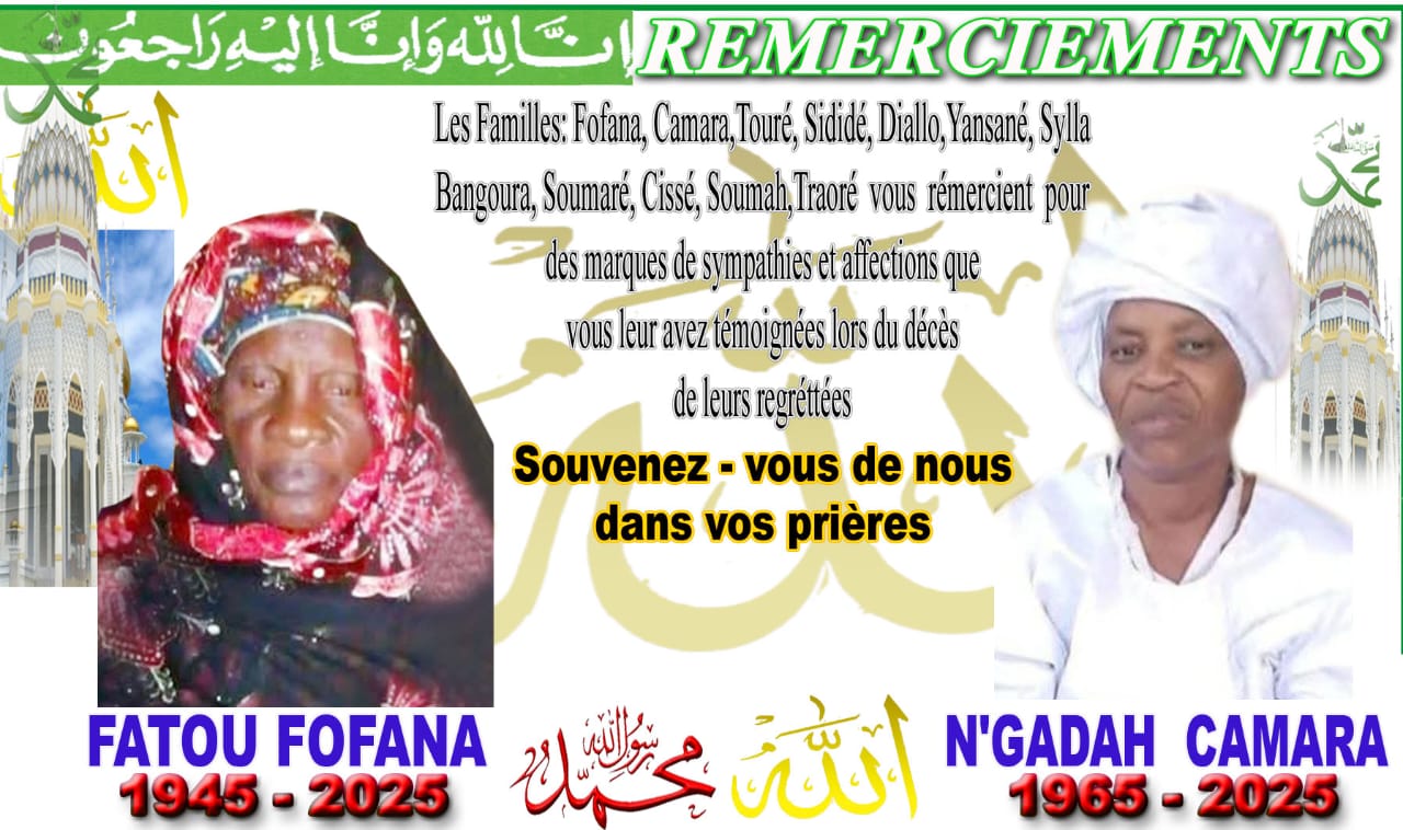Les familles Fofana, Camara, Touré, Bangoura, Yansané, Traoré, Diallo, Cissé, Sidibé et Soumaré informent toutes les personnes qui ont compati à leur douleur lors du décès des regrettées Fatou Fofana et Ngada Camara, qu’elles organisent la cérémonie du sacrifice du 40e jour le dimanche 20 avril 2025 à Belle Vue, après la prière de 14 heures.