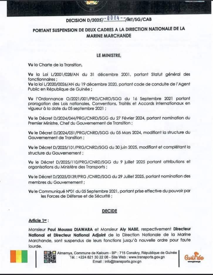 C’est une décision de dernière minute dont une copie est parvenue à AvenirGuinée. Le ministre des Transports, Ousmane Gaoual Diallo, vient de suspendre le directeur national de la Marine marchande, Paul Moussa Diawara, ainsi que son adjoint, Aly Nabé, pour « faute lourde ».