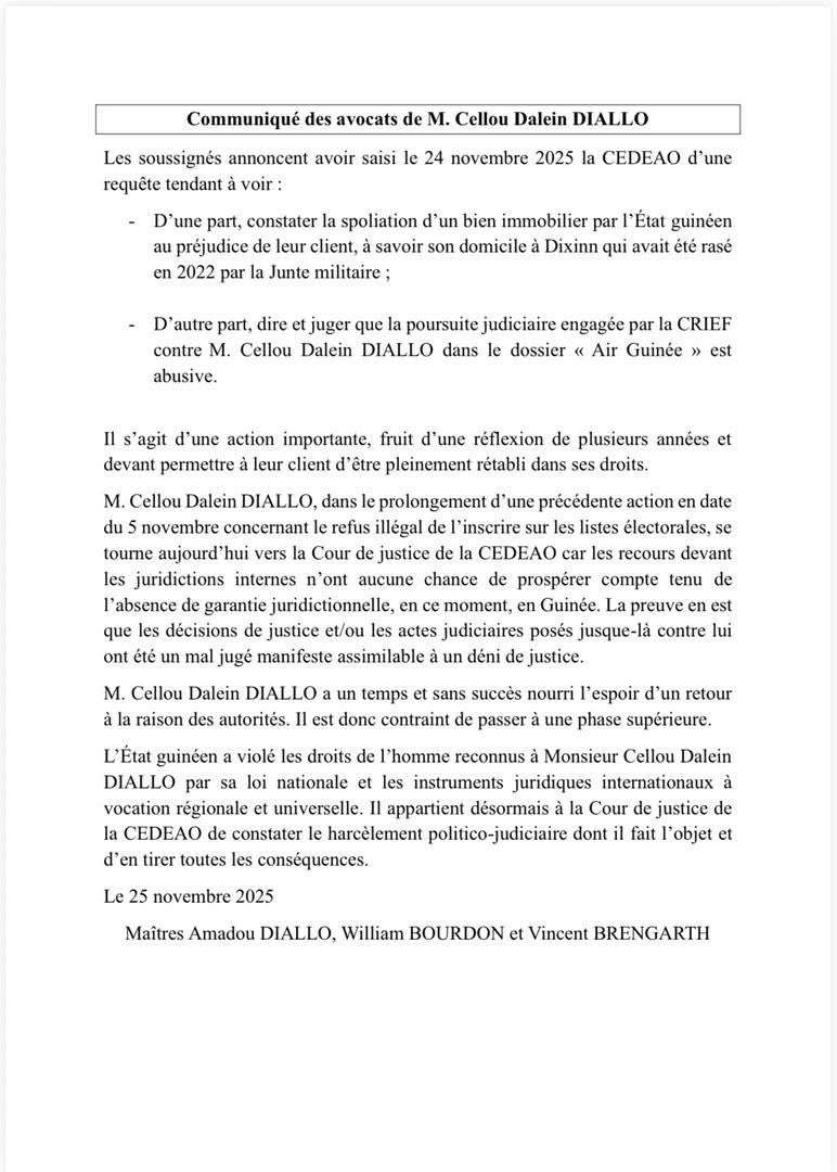 Dans un communiqué parvenu à avenirguinee.org, les avocats de l’ancien Premier ministre Cellou Dalein Diallo, cité dans l’affaire de la vente de l’avion d’Air-Guinée, annoncent avoir saisi la Cour de justice de la CEDEAO.