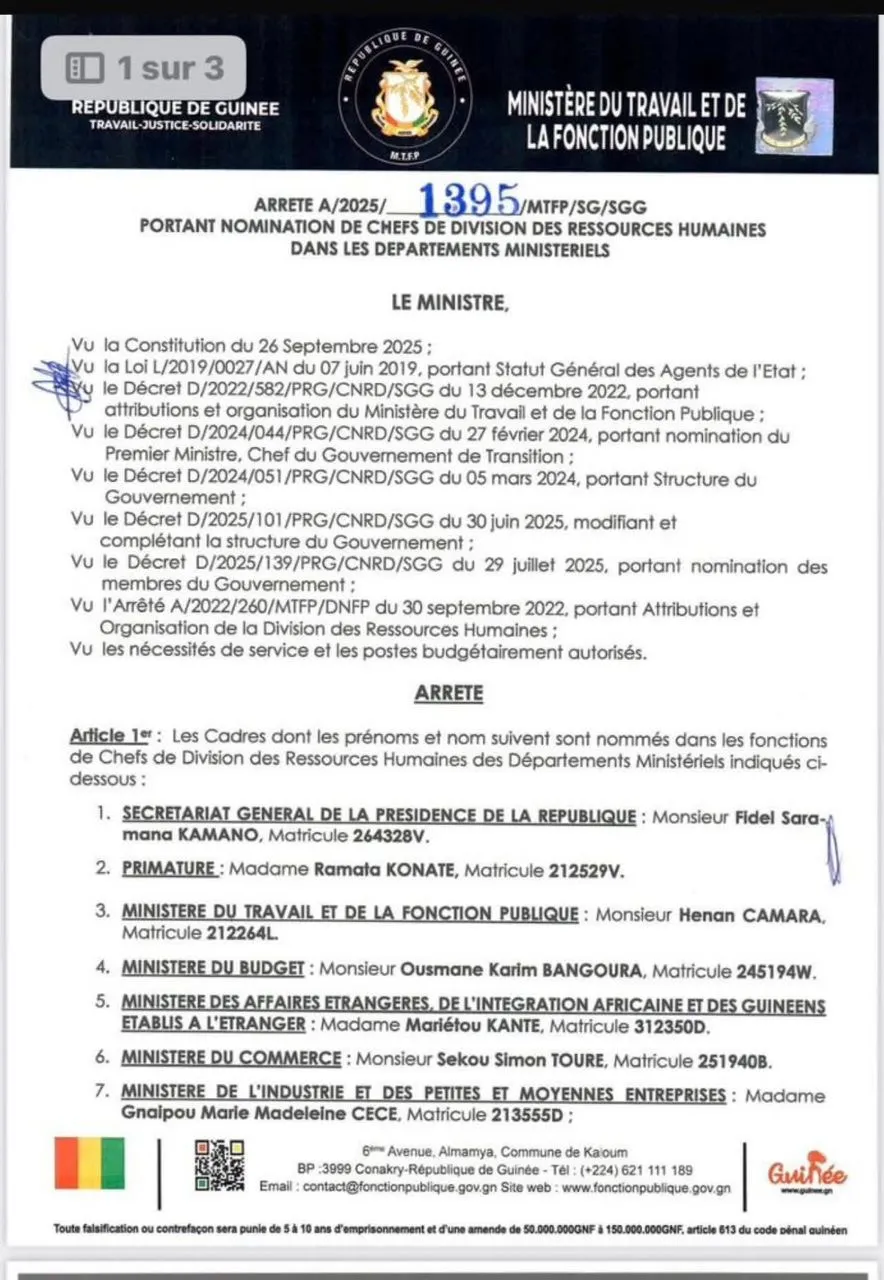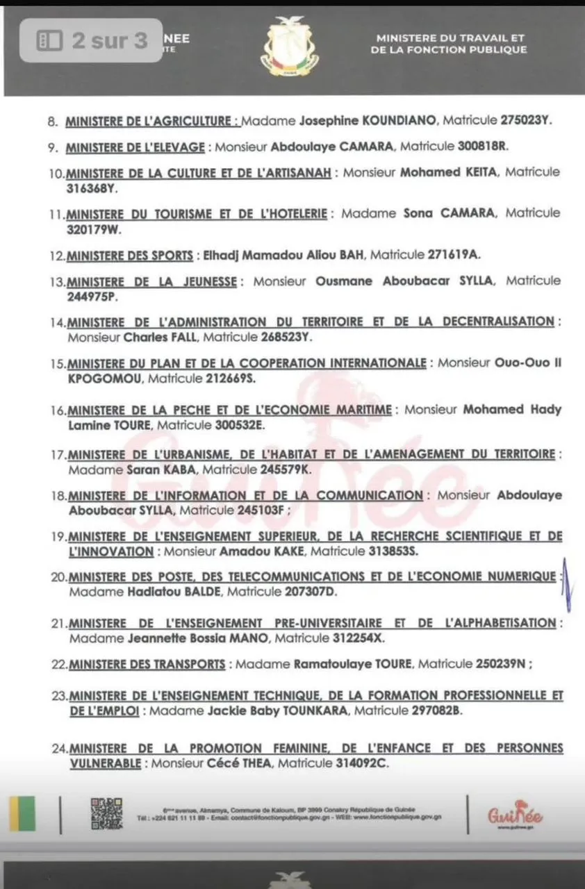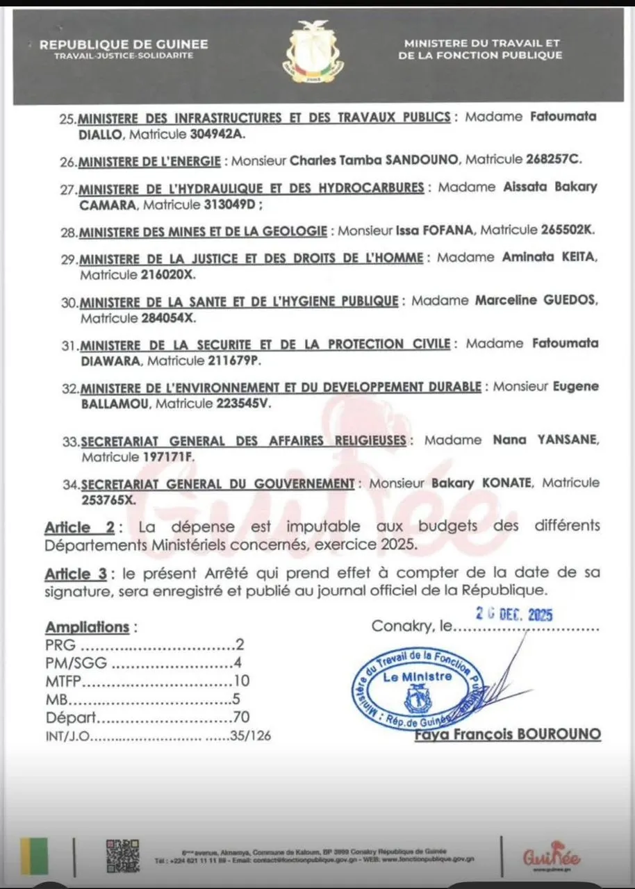 Dans un récent arrêté, le ministre de la fonction publique, François Bruno a procédé à la nomination de 34 cadres au sein de l’administration guinéenne.