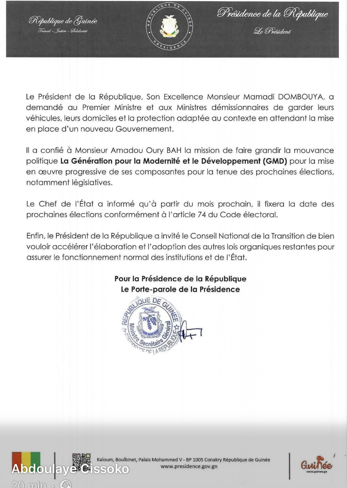 Bien qu’il ait quitté ses fonctions de Premier ministre, Amadou Oury Bah se voit confier une nouvelle mission par le président de la République. Mamadi Doumbouya lui a demandé de travailler au renforcement et à la structuration de la GMD, le mouvement politique ayant soutenu sa candidature à l’élection présidentielle.