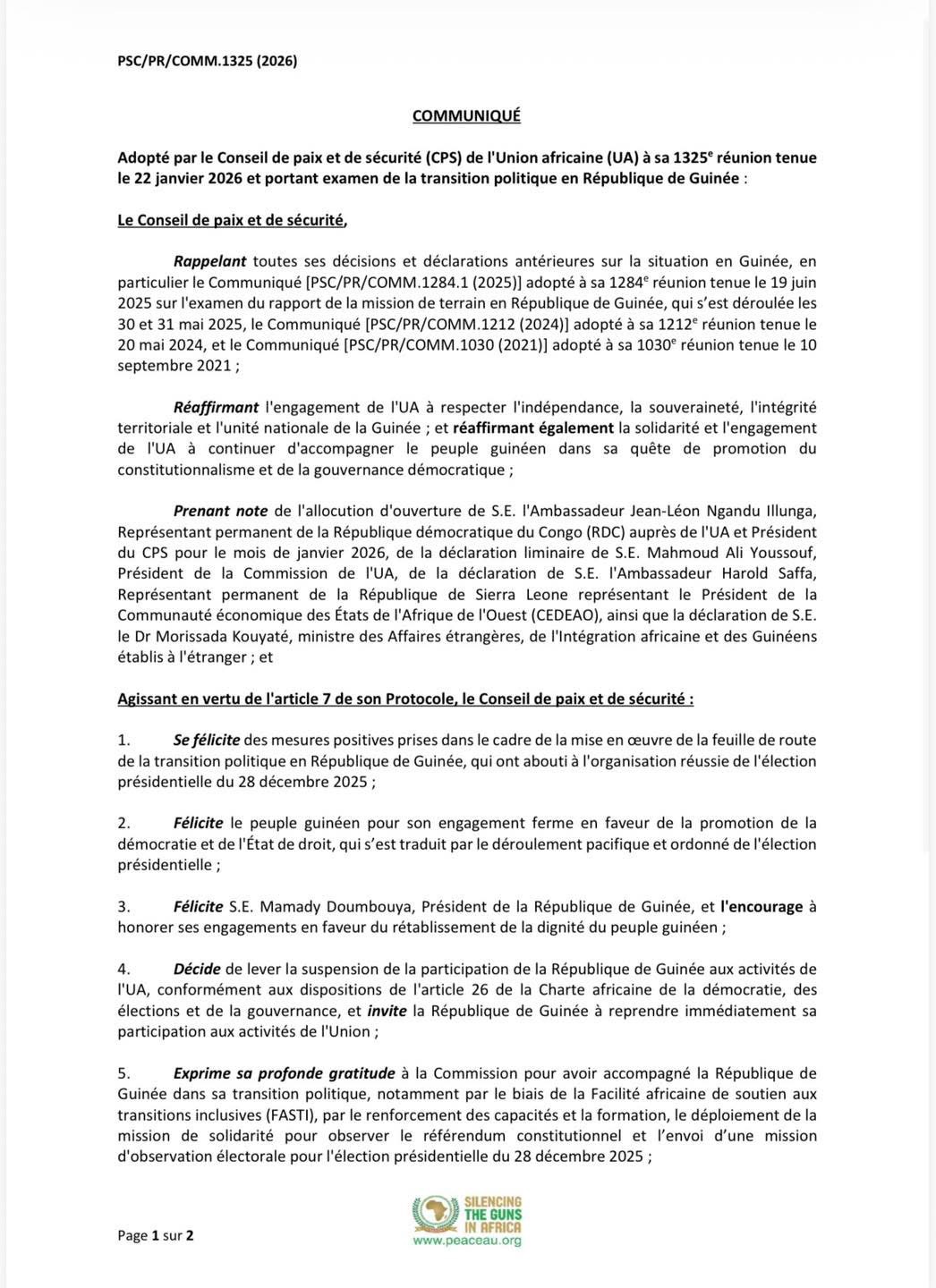 Réuni le 22 janvier 2026 à Addis-Abeba, le Conseil de paix et de sécurité de l’Union africaine s’est félicité des avancées enregistrées dans le cadre de la transition politique en Guinée, marquée par l’organisation de l’élection présidentielle du 28 décembre 2025. Saluant l’engagement du peuple guinéen et des autorités, l’UA a décidé de lever la suspension du pays de ses activités et appelle à la poursuite des efforts en faveur de la démocratie, de la réconciliation nationale et de l’organisation des législatives.