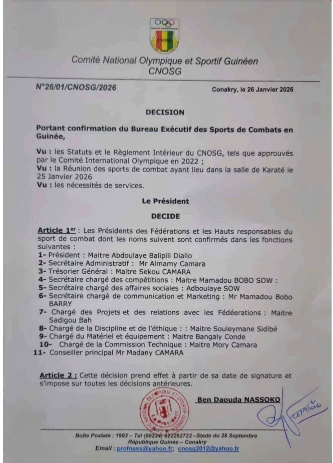 Désormais aux commandes d’une équipe de 11 dirigeants, M. Abdoulaye Balipili Diallo mettra son expérience éprouvée au service de cette nouvelle mission. Connu pour son engagement de longue date et ses services rendus à la tête de la Fédération de Judo, il aura pour priorité de promouvoir et de valoriser les sports de combat, conformément à la vision stratégique du Comité Olympique guinéen.