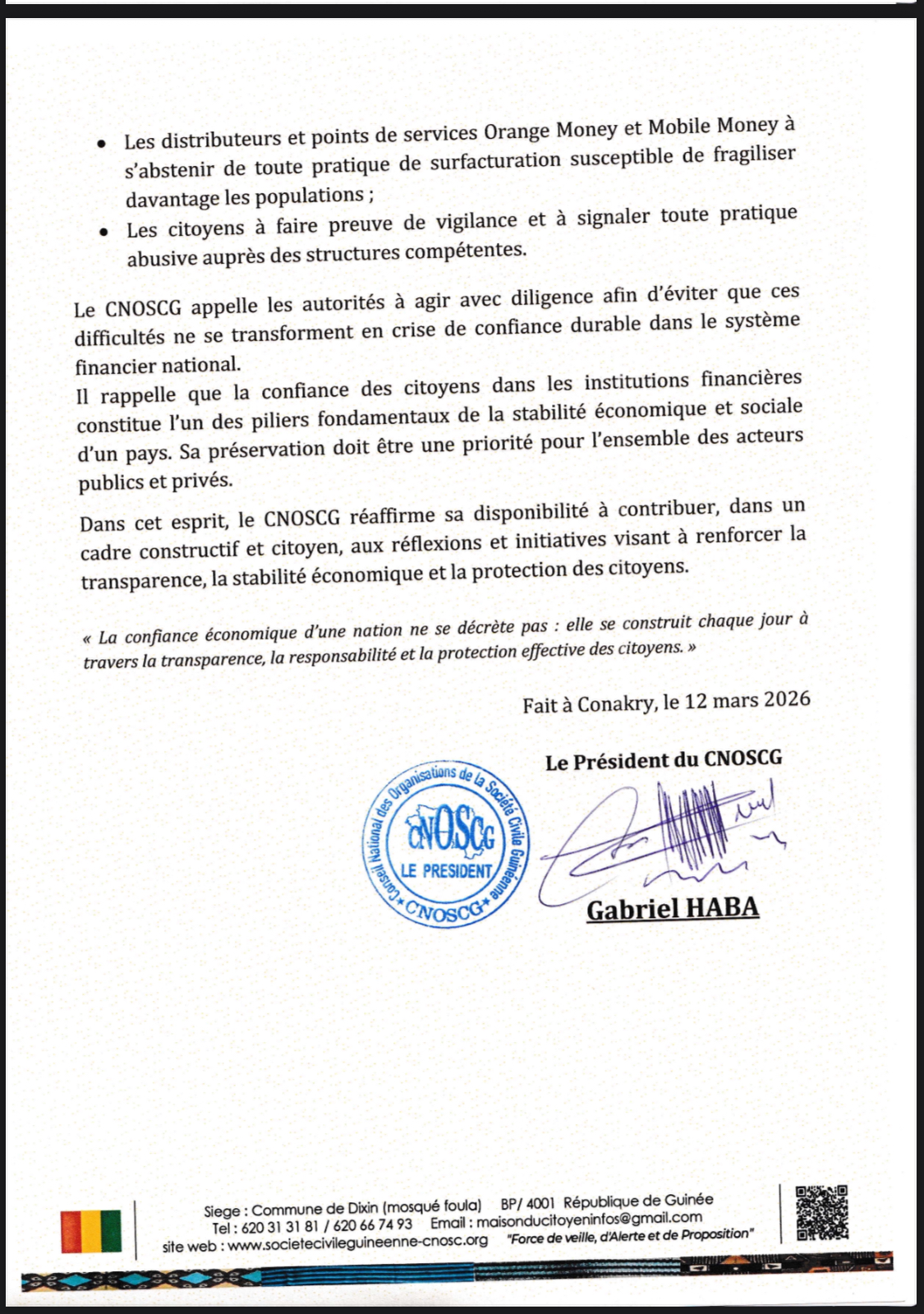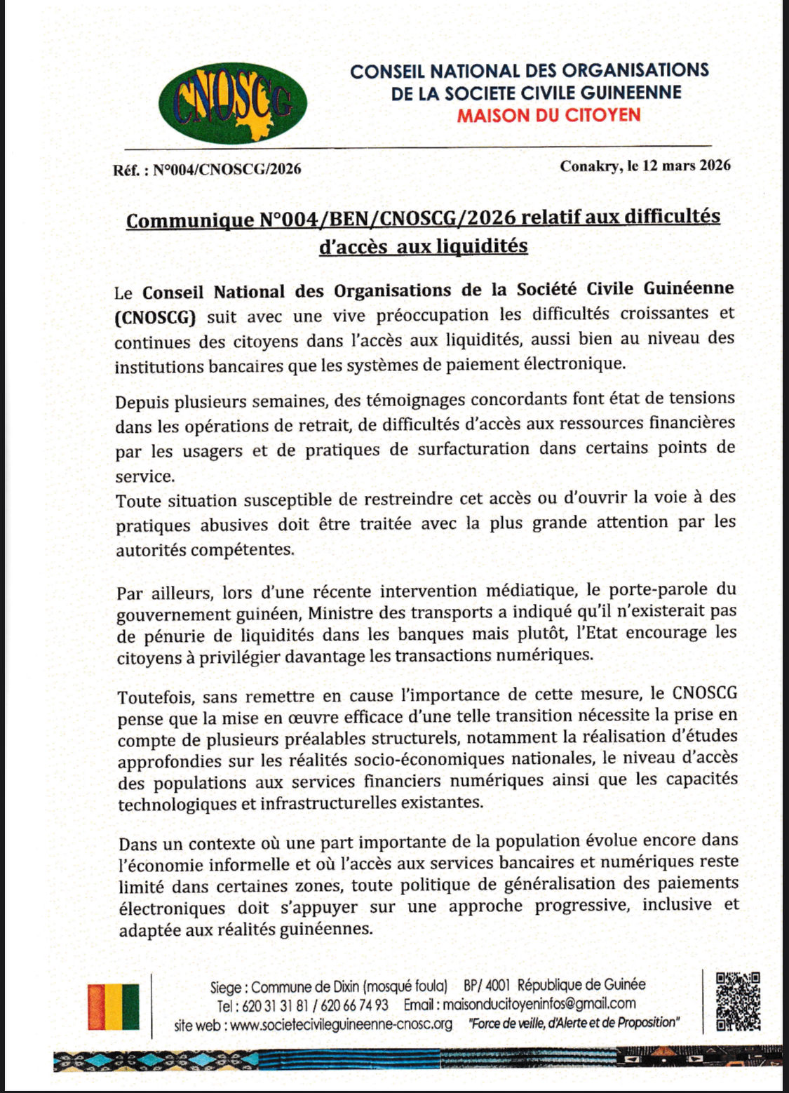 Face aux difficultés croissantes d’accès aux liquidités qui frappent les citoyens guinéens, le Conseil National des Organisations de la Société Civile Guinéenne (CNOSCG) a publié ce 12 mars 2026 un communiqué officiel exprimant sa « vive préoccupation ».