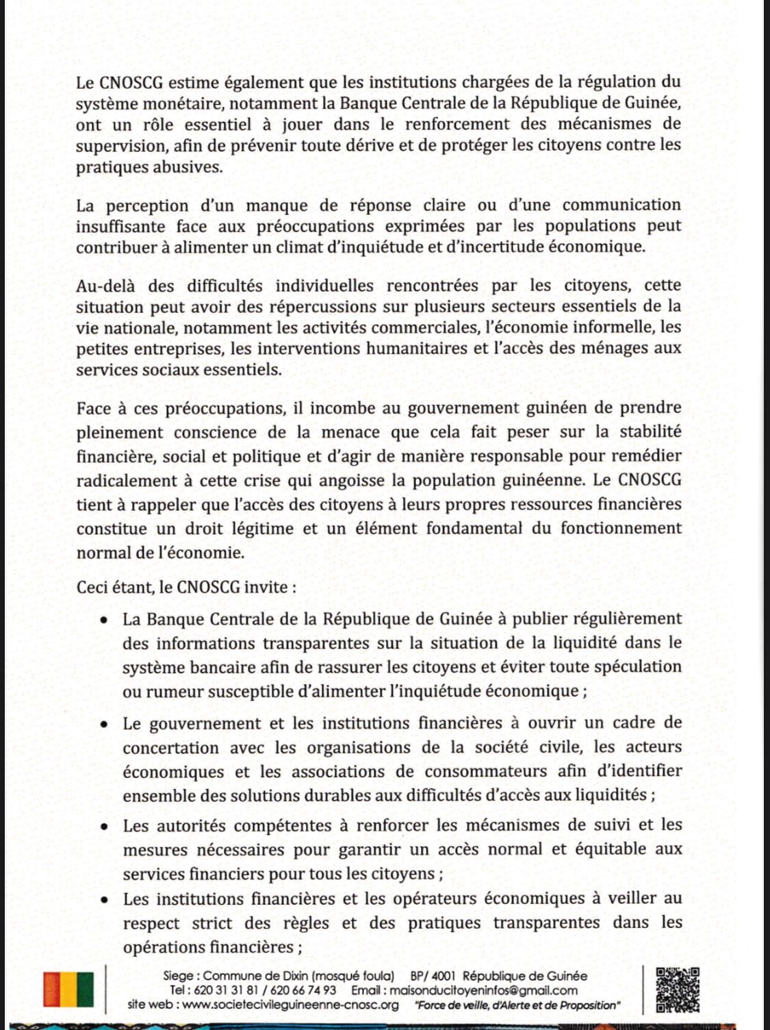 À travers une série de recommandations adressées à la Banque Centrale et aux institutions financières, le CNOSCG appelle à une transparence immédiate et à une approche plus inclusive pour restaurer la confiance des citoyens et préserver la stabilité sociale du pays.