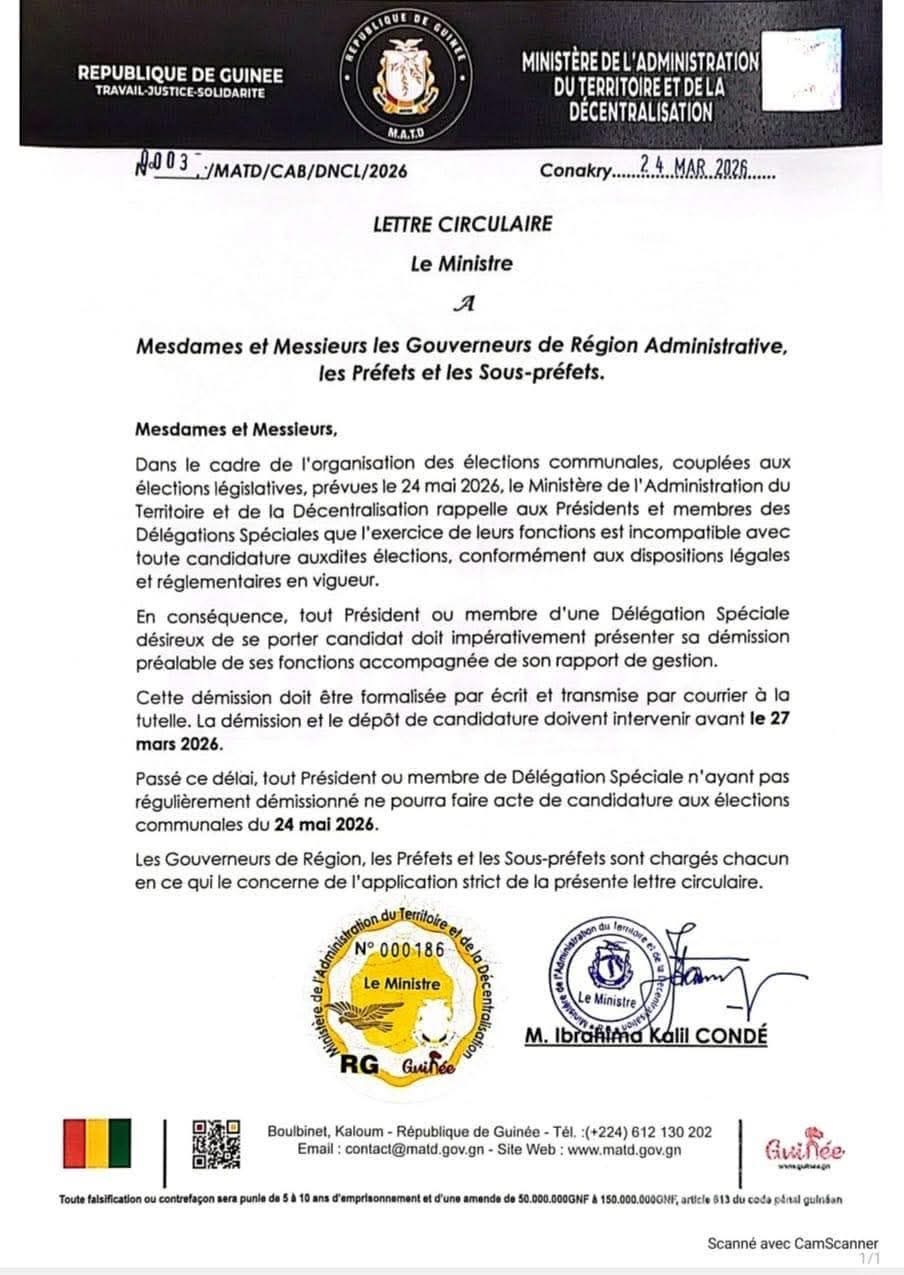 Par une lettre circulaire datée de ce mardi 24 mars 2026, le Ministre de l’Administration du Territoire et de la Décentralisation (MATD), M. Ibrahima Kalil Condé, a fixé les règles de candidature pour les prochaines échéances électorales.