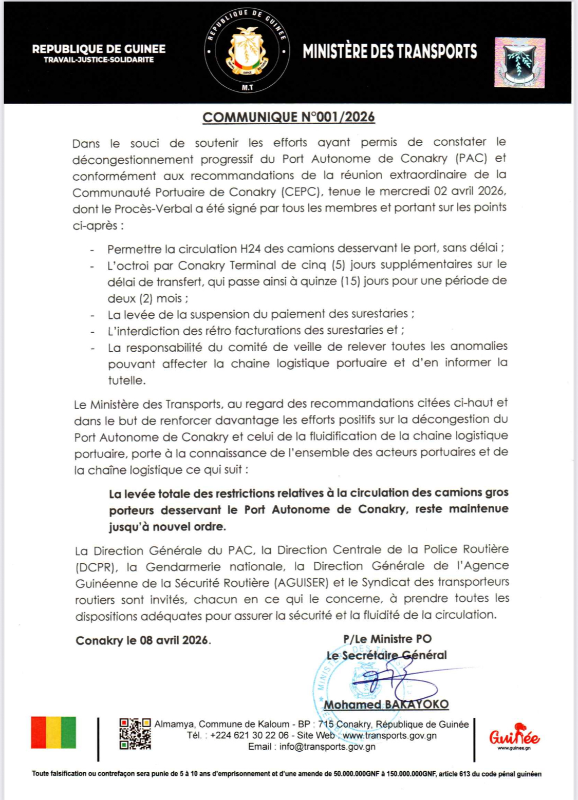 Dans un communiqué publié ce mercredi 8 avril 2026, le ministère des Transports a annoncé une série de mesures fortes pour fluidifier la chaîne logistique au Port Autonome de Conakry (PAC). Parmi les décisions phares figurent la levée totale des restrictions de circulation pour les gros porteurs (désormais autorisés 24h/24), l’extension du délai de transfert à 15 jours, ainsi que la suspension du paiement des surestaries. Ces réformes, issues d’une concertation avec la Communauté Portuaire, visent à accélérer le déchargement du port et à soutenir les acteurs économiques en réduisant les coûts logistiques.