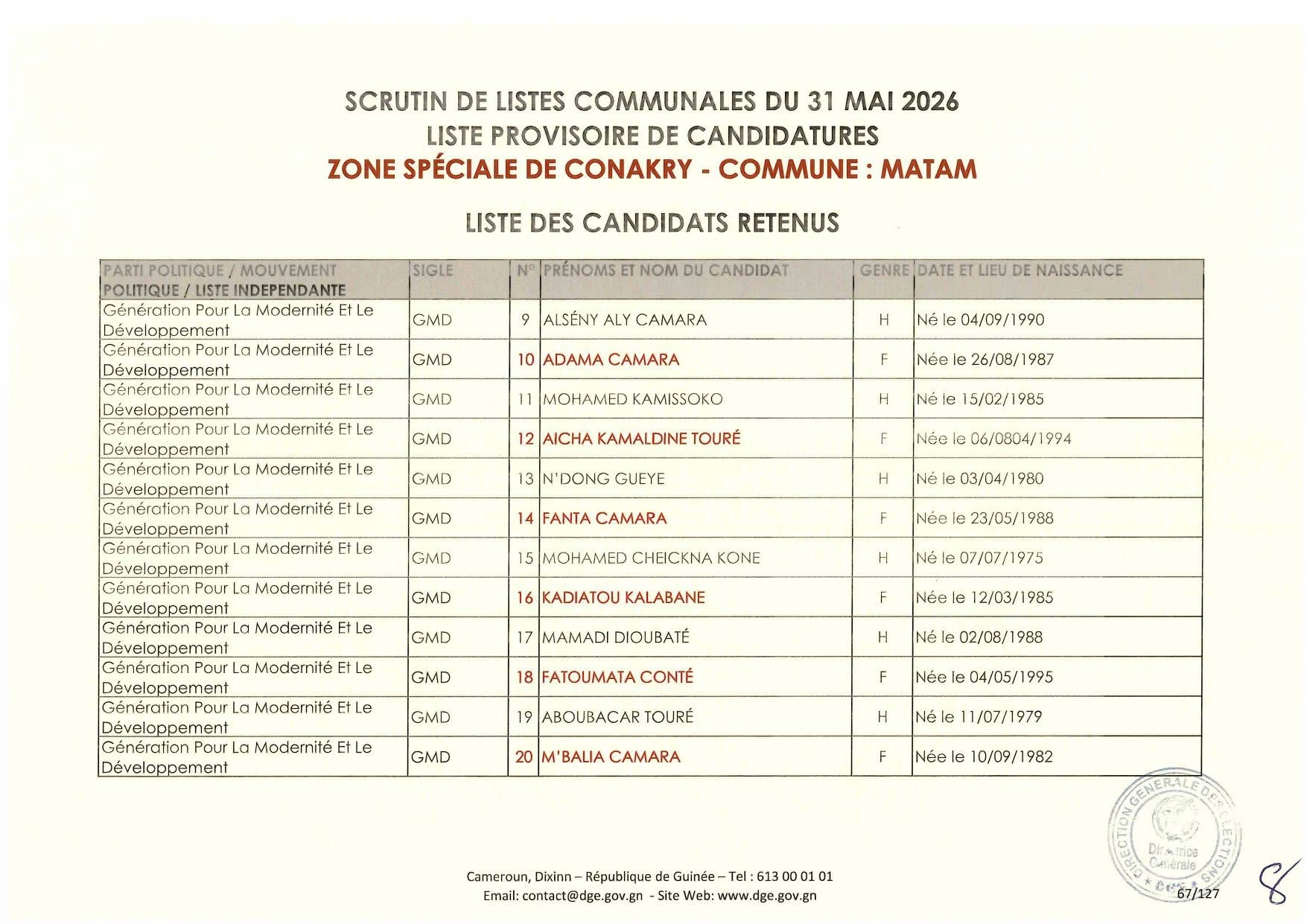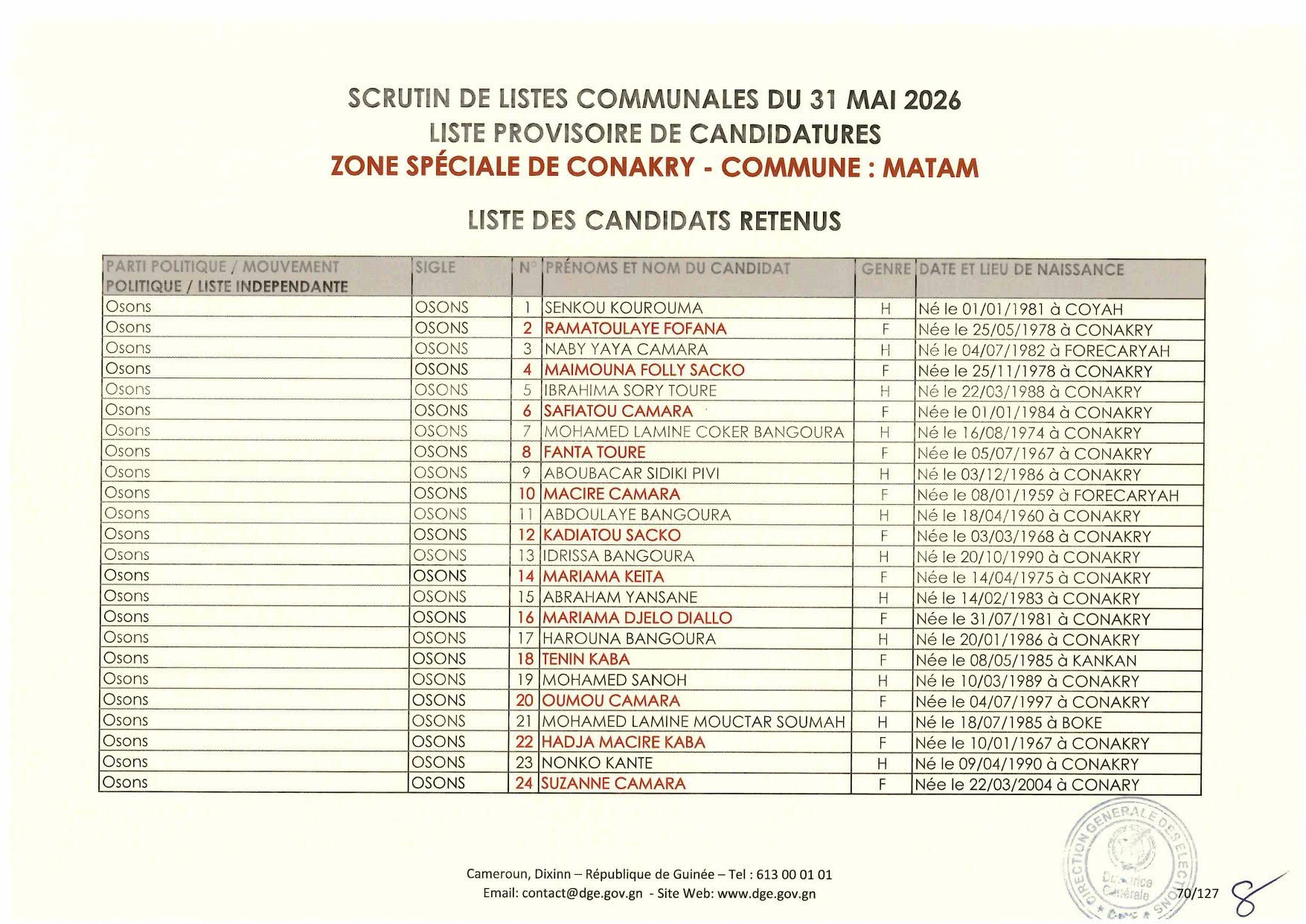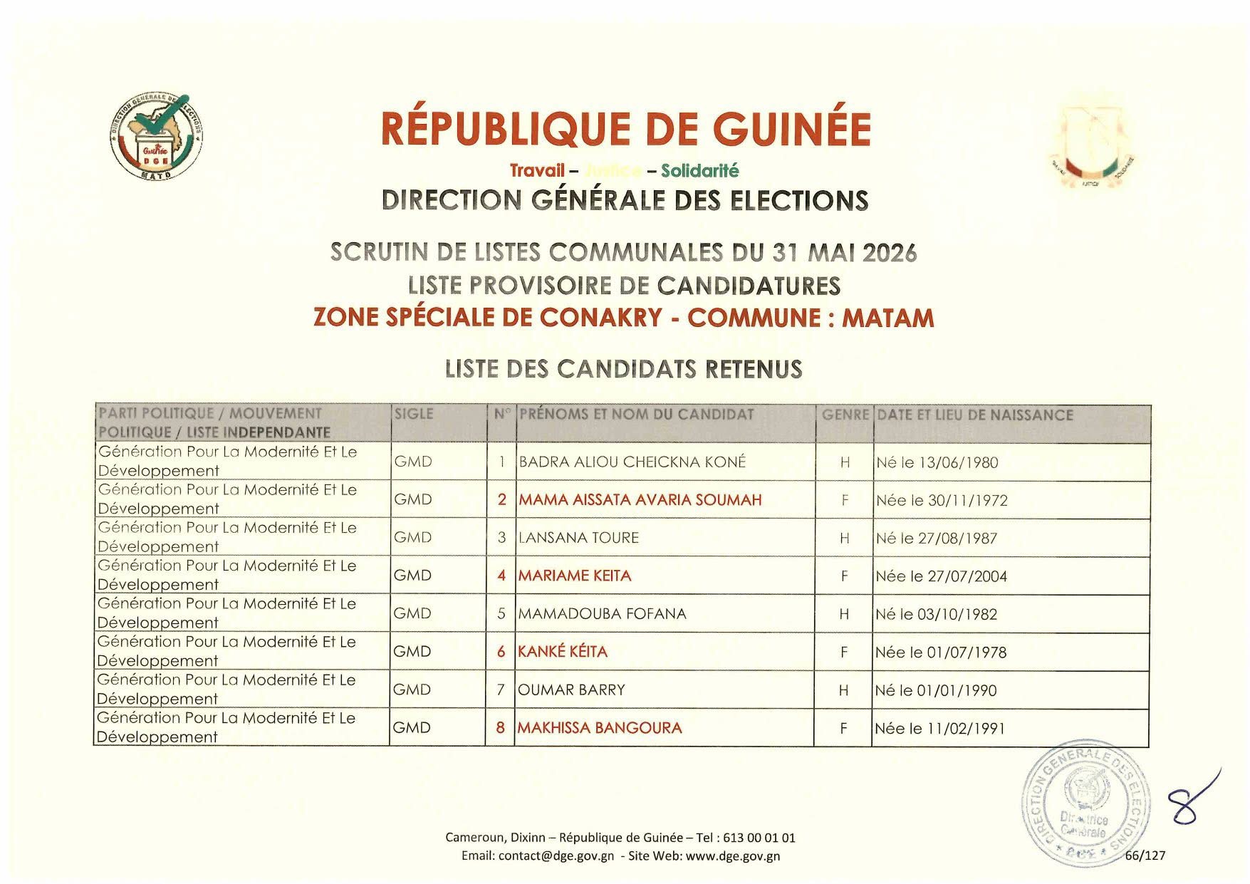 La Direction Générale des élections la publié la nuit dernière la liste des candidatures retenues dans le cadre des élections communales prévues le 31 mai 2026.